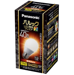 パナソニック LED電球 プレミアX LDA5L-D-G/S/Z4/F 電球色 40W形相当 全方向タイプ LDA5LDGSZ4F パナソニック LED電球 プレミアX LDA5L-D-G/S/Z4/F 電球色 40W形相当 全方向タイプ (11-719886) LED電球プレミアX 一般電球タイプ 全方向タイプ ◆メーカー◆ パナソニック ◆ 光源色 ◆ 電球色相当・2700ケルビン ◆定格消費電力◆ 4.9W ◆定格入力電流◆ 0.085A ◆ 寸法 ◆ 全長 98mm 外径 55mm ◆ 質量 ◆ 65g ◆ 口金 ◆ E26 ◆全光束◆ 485ルーメン ◆消費効率◆ 98.9m/W ◆定格寿命◆ 40000時間 ◆平均演色評価数◆ Ra90 在庫状態 : 注文可 ¥2,080(税込) 数量 パナソニック LED電球 プレミアX LDA5L-D-G/S/Z4/F 10個セット 電球色 40W形相当 全方向タイプ 在庫状態 : 注文可 ¥19,800(税込) 数量